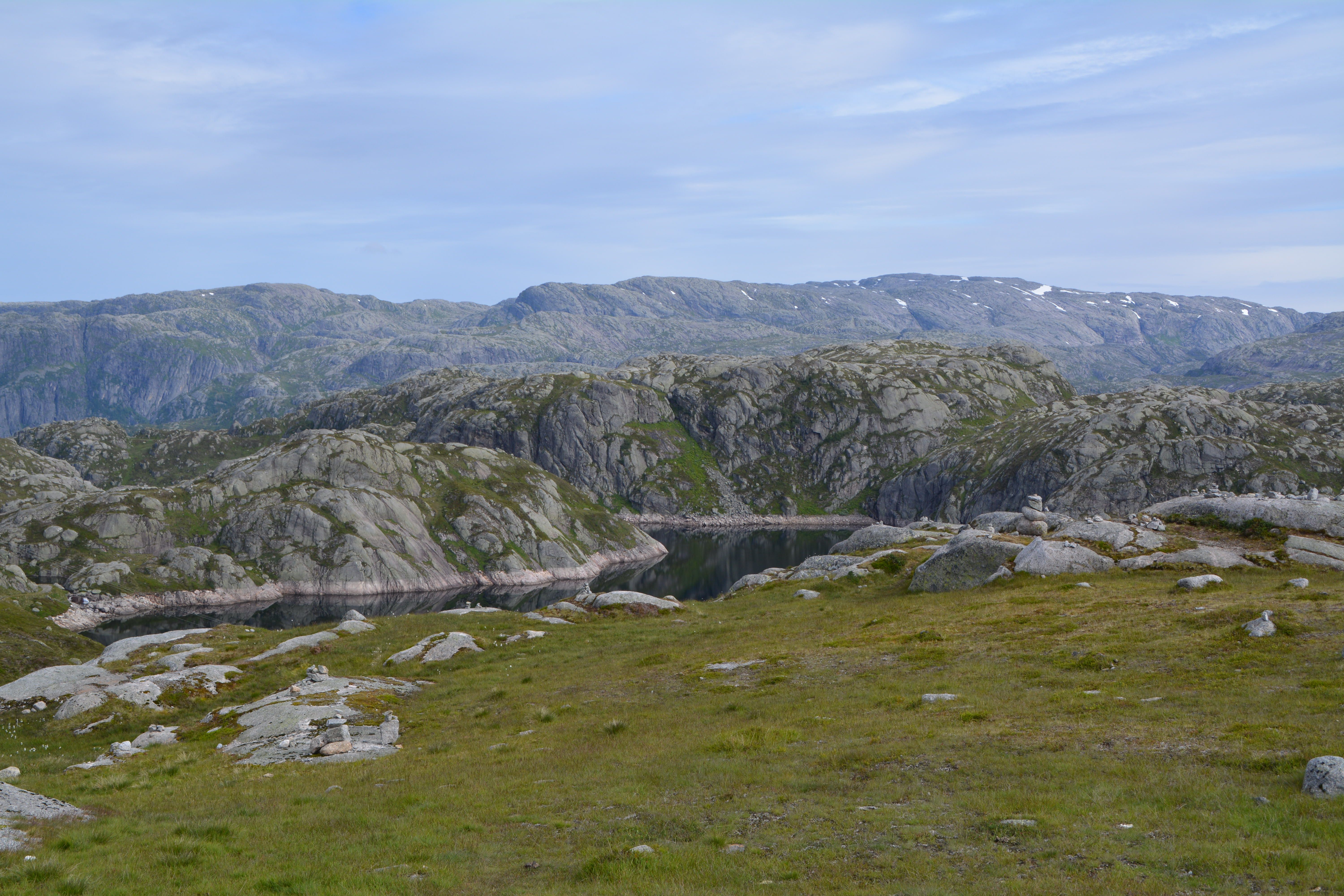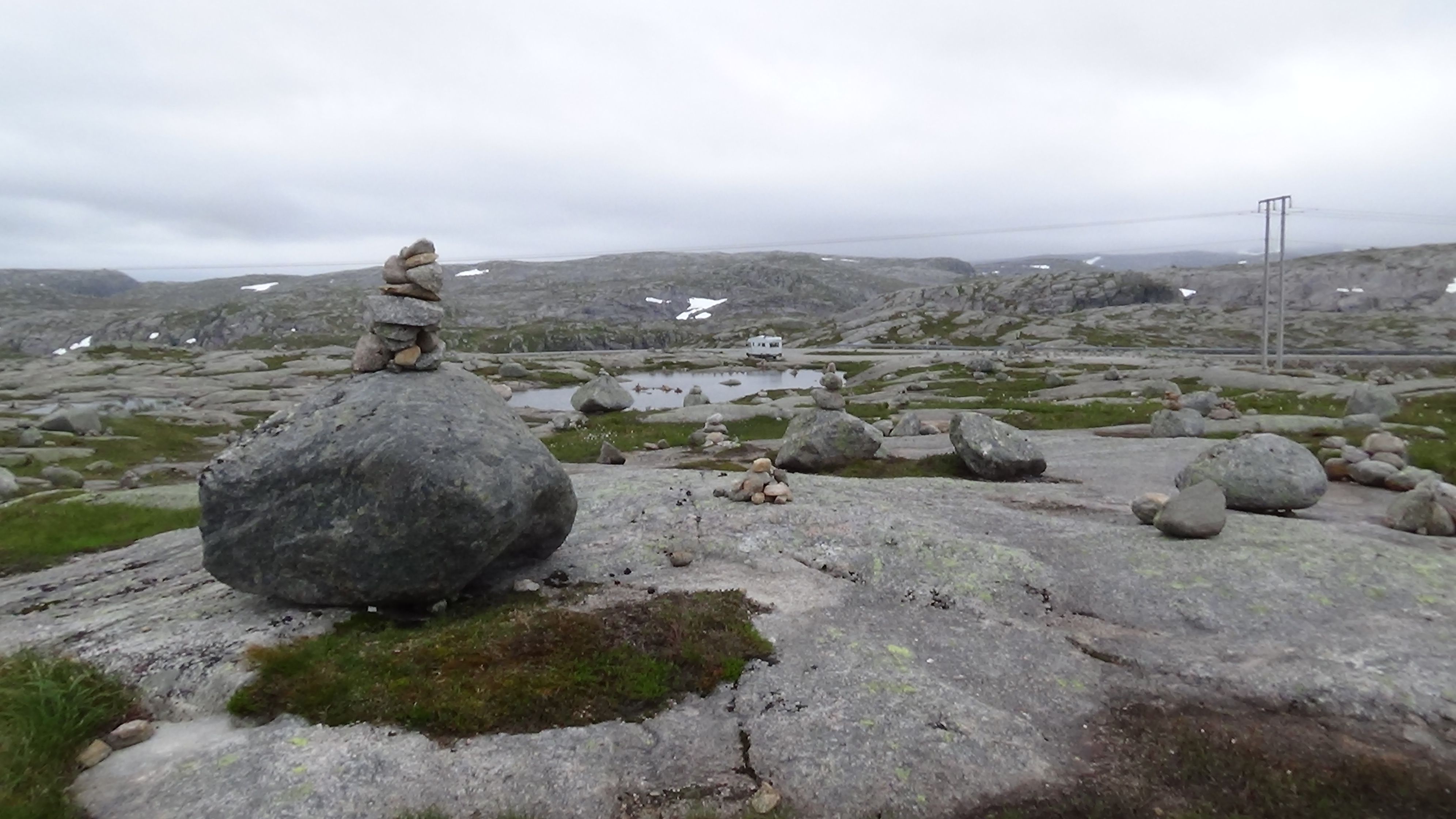 Après cette longue traversée, on entame la descente vertigineuse sur Lysebotn, par une route en lacets ( 27 à l'aller, et 27 au retour, puisqu'il nous faudra revenir sur nos pas, aucune autre  route ne permet en effet de quitter Lysebotn. On passe ainsi de 1000 m d'altitude à zéro , niveau du fjord, en une vingtaine de minutes, et la descente se termine par le passage d'un tunnel, à une seule voie de circulation, mais avec des zones de croisement aménagées, et le tunnel fait lui même 2 lacets avant de déboucher sur le port de Lysebotn. C'est une expérience extraordinaire , où l'on découvre le génie des batisseurs de cette route ouverte en 1984. Fallait oser,  ils l'ont fait  !